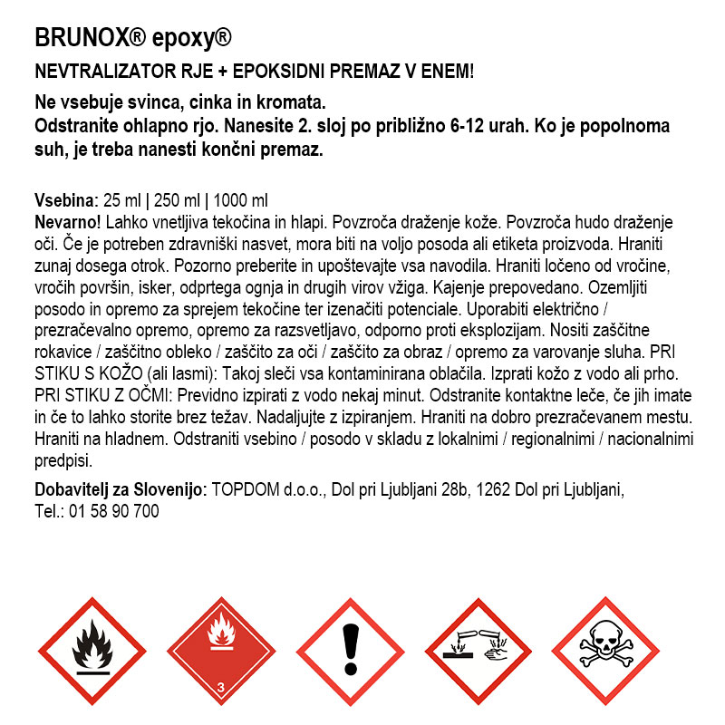 Antikorozijsko sredstvo Brunox Epoxy je patentiran odstranjevalec, nevtralizator in pretvornik rje ter temeljni premaz v enem. Omogoča hitra in enostavna popravila in obnovo rjastih površin. Tvori organokovinski kompleks železa z železom in rjo. Nastane črna, zelo kompaktna in odporna zaščitna plast, ki površini zagotovi dolgotrajno protirjavno zaščito. Z dodatkom epoksidne smole hkrati ustvari tudi temeljno plast za nadaljnjo obdelavo s kiti ali zaključnimi premazi.