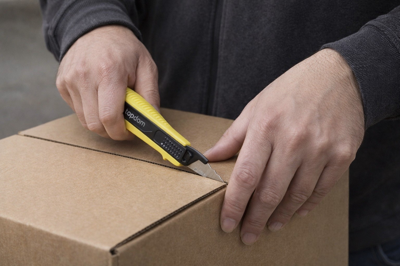 Vsestransko uporaben olfa nož z lomljivim rezilom, v plastičnem ohišju s plastičnim podajalcem in zaklepom.
