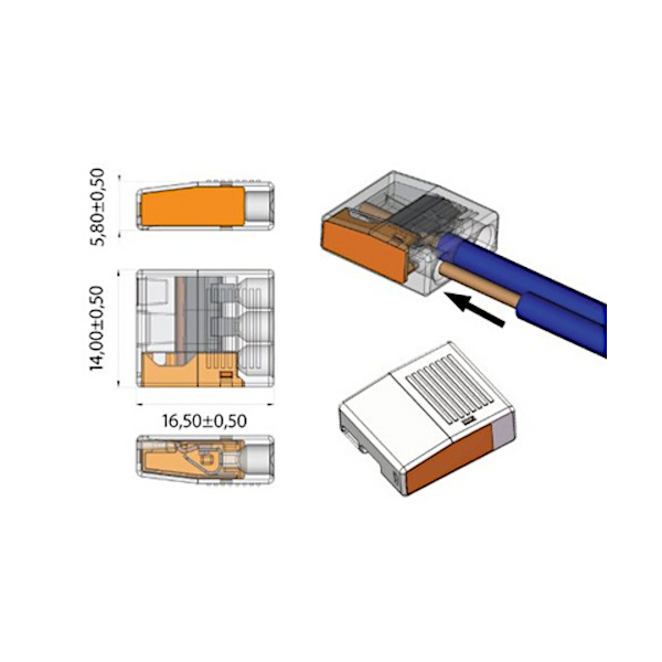 Inštalacijska mini sponka za trdo žico. Ergonomsko zasnovano ohišje, ki nudi popolno zaščito proti dotiku in tehnologija “twist&pull”, ki omogoča enostavno iztaknitev že vgrajenega vodnika.