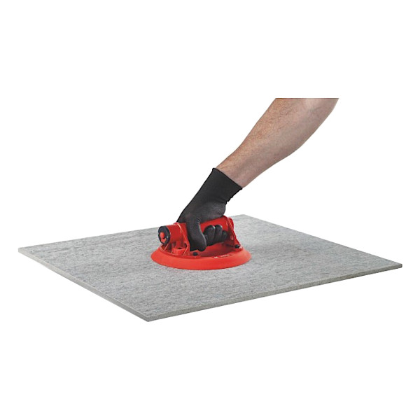 Profesionalno enoročno vakuumsko prijemalo na baterijo, za dvigovanje in prenašanje keramičnih plošč velikega formata, tlakovcev ali neporoznih kamnitih plošč. S pritiskom na gumb, prijemalka samodejno vzpostavi in uravnava optimalen tlak za varen dvig in prenos plošče. Vrednost tlaka je jasno prikazana na digitalnem zaslonu, ki nakazuje tudi stanje baterije. Prisesek z mehko gumo se dobro oprime tako gladkih kot rahlo teksturiranih nedrsečih površin.