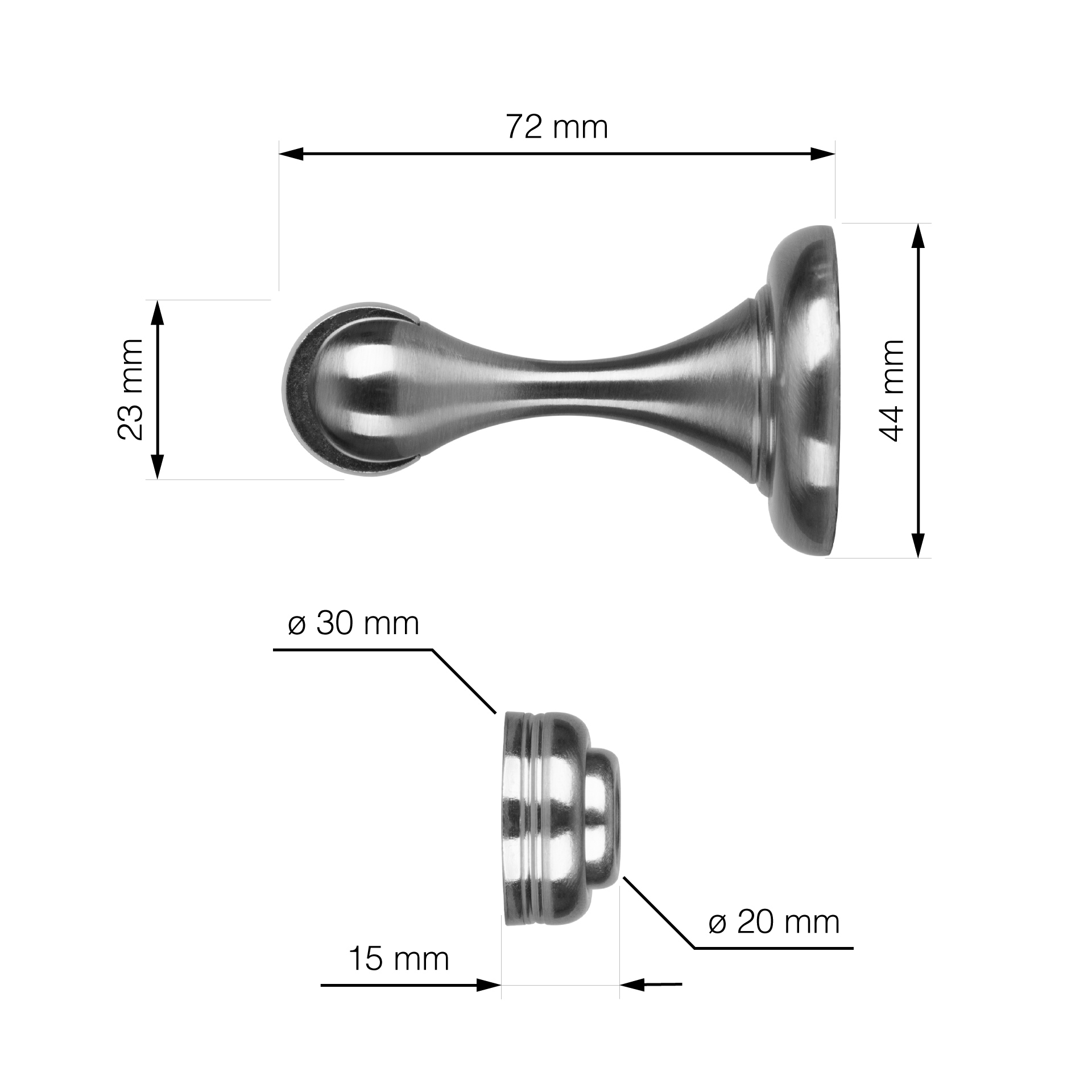 Kovinska magnetna zapora za vrata v mat nikljevi barvi, širine 44 mm in višine 87 mm. Primerna za pritrditev na steno z vijaki. Ščiti steno pred udarci. Priložen je montažni material.